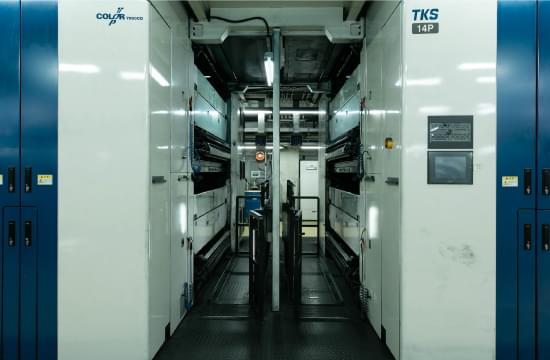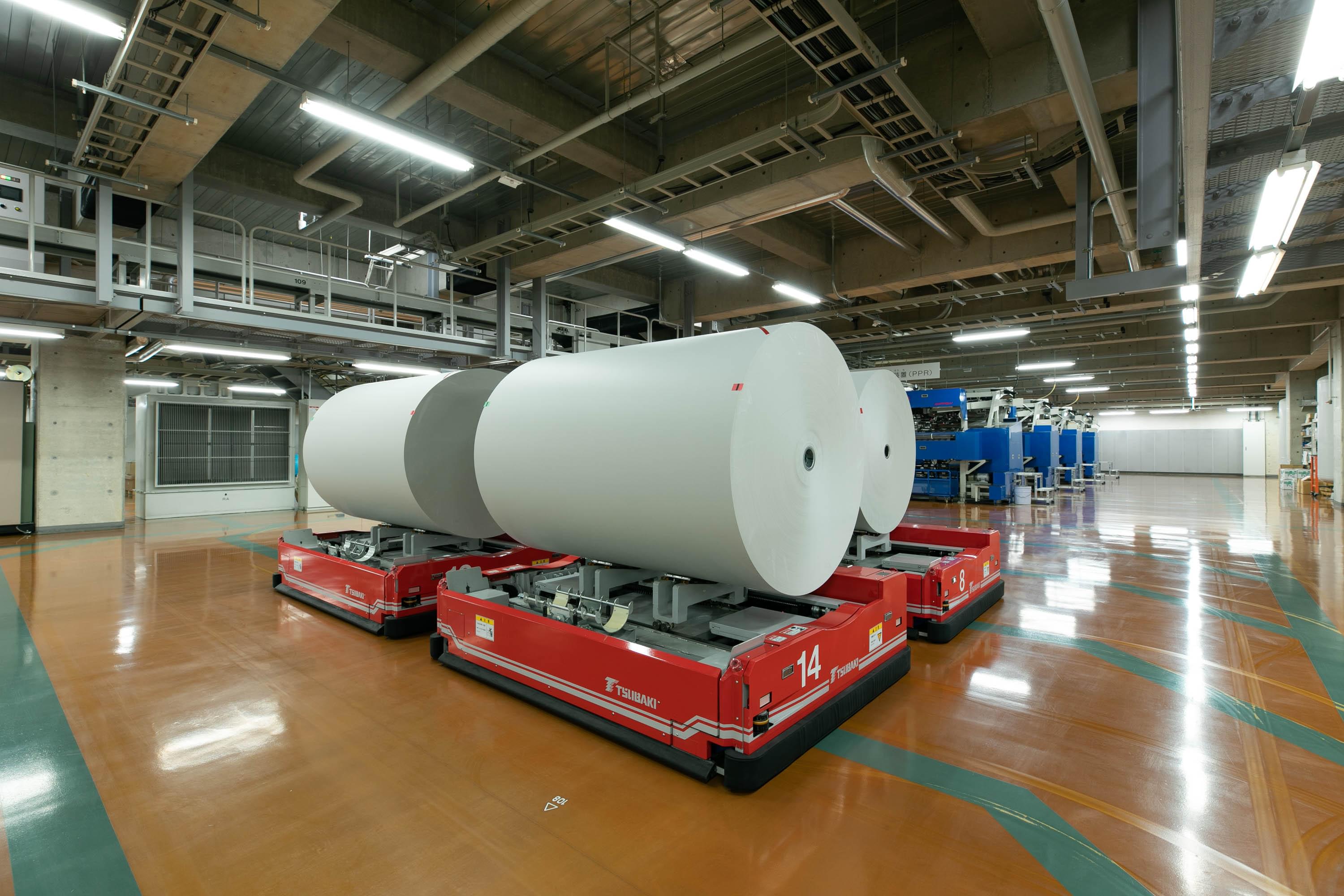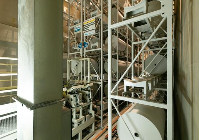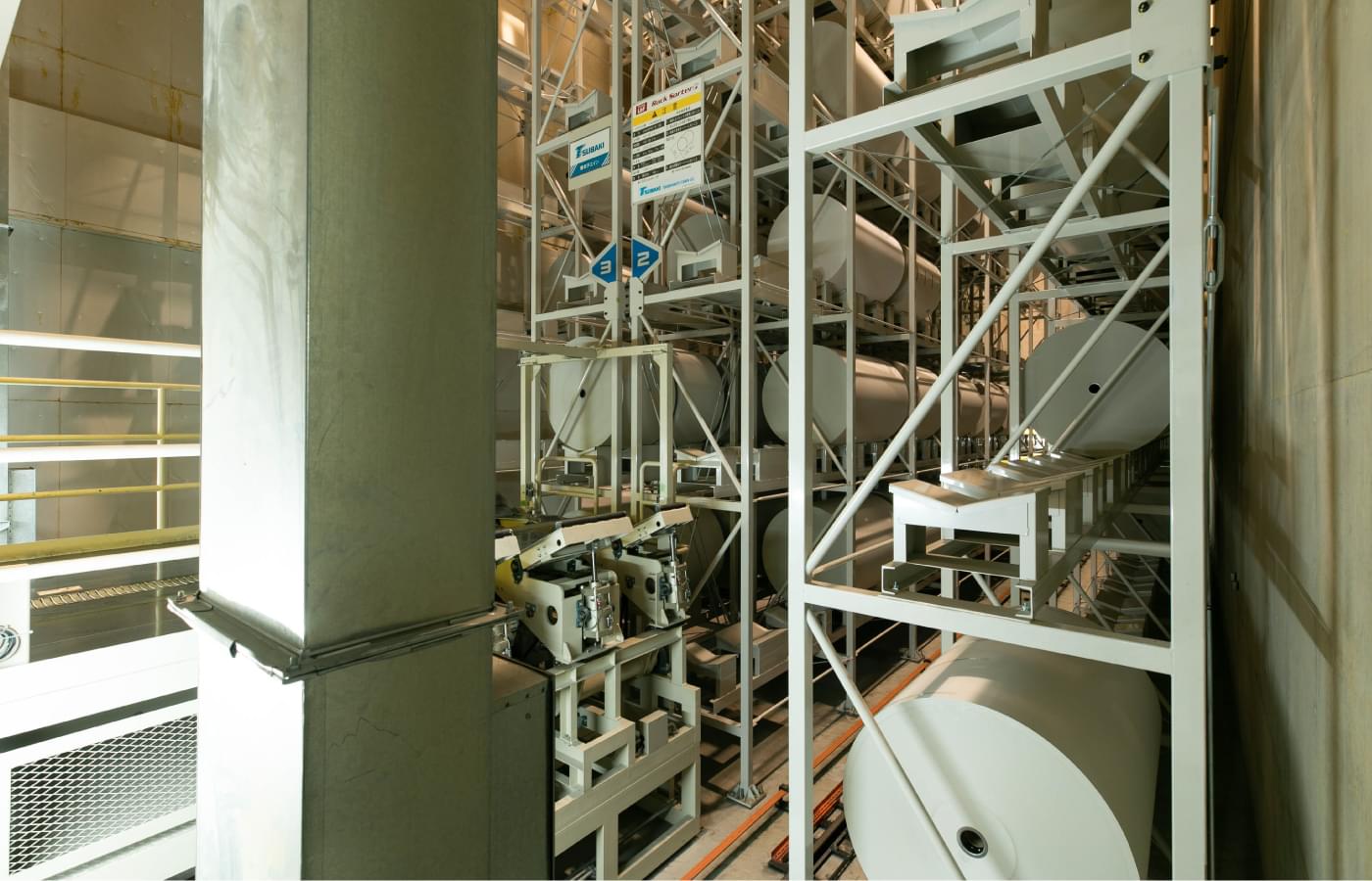 新聞の素となる紙はロール状となっており、これを「巻き取り紙」と呼びます。量としては、1 本で40 ページの新聞が6000部印刷できるほど。巻き取り紙を保管する紙庫の形態は工場により異なり、辻町北工場では省スペースな立体紙庫を採用しています。
