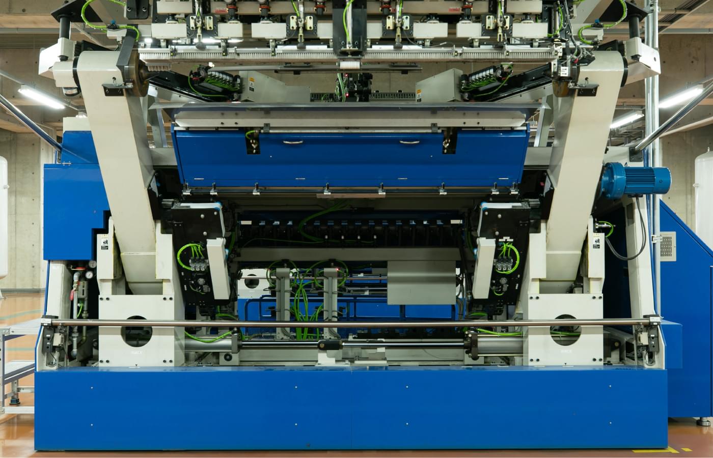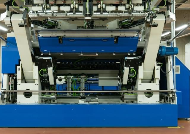 巻き取り紙の重さは1本で約1.4tにもなり、当然ですが人力で運ぶことはできません。そこで、巻き取り紙を紙庫から輪転機まで運ぶ役割を担うのが、巻き取り紙搬送台車。輪転機の給紙部へ装着する工程も、この機械が行います。